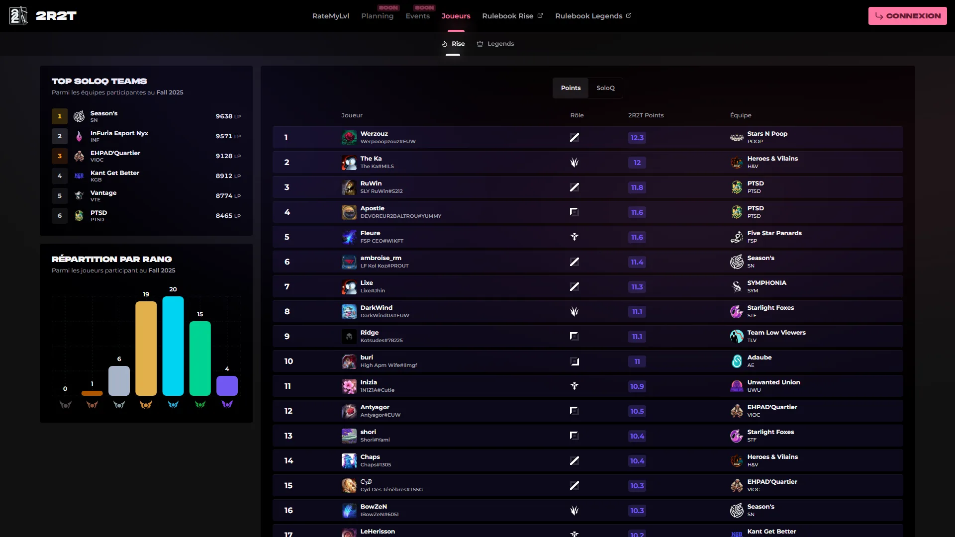 2R2T est une plateforme esports amateure émergente visant à devenir la référence pour League of Legends compétitif en France. Le site avait été conçu 'desktop-first' avec des mises en page animées complexes et des assets de jeu flottants, mais n'avait aucune expérience mobile — coupant une majorité d'utilisateurs. De plus, la plateforme avait besoin d'un système de notation juste et transparent pour évaluer les joueurs à travers différents rôles et niveaux de compétence.